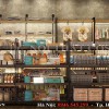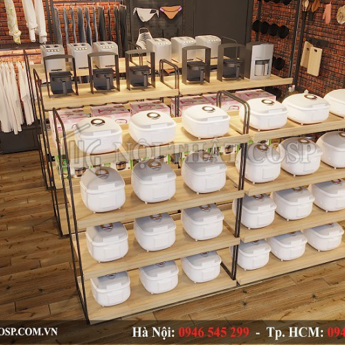 Ở giữa không gian cửa hàng là 2 chiếc kệ sắt sơn tĩnh điện lớn và 3 chiếc kệ gỗ nhỏ được đặt vuông góc với nhau.