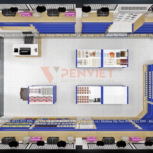 Phong cách: Hiện đại, sang trọng và tinh tế. Hệ thống nội thất được thiết kế vuông vắn với nhiều tầng để có thể trưng bày được nhiều sản phẩm nhất và độ bền, khả năng chịu lực là cao nhất.