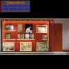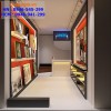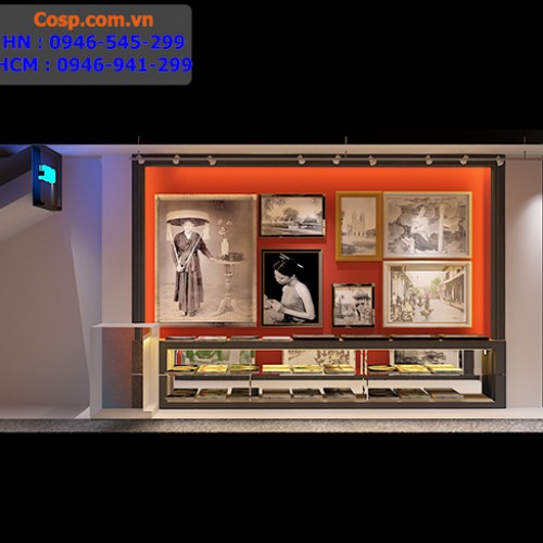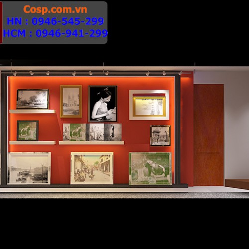 Với 2 loại tranh : tranh có khung và tranh không có khung được bố trí theo cách khác nhau. Từ đó, trong thiết kế đã sử dụng các đợt gỗ và các tủ kính bên dưới có ánh sáng trang trí, tận dụng tối đa diện tích mà vẫn có thể bầy sản phẩm một cách khá sinh động.