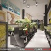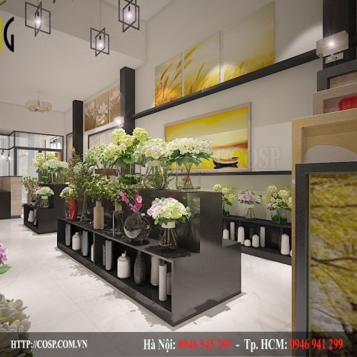 Hai bên sát chân tường cùng với hàng kệ giữa nhà dùng để trưng bày sản phẩm hoa vải cao cấp. Phía trên được thiết kế kệ bắt trực tiếp trên tường để trang trí tranh.
