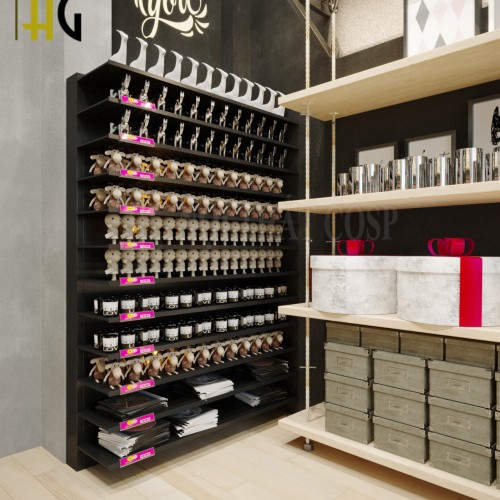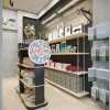 Hệ thống quầy kệ trưng bày trong cửa hàng bao gồm kệ trưng bày giữa nhà và kệ trưng bày sát tường. Các kệ trưng bày thiết kế cực kỳ hiện đại và khỏe khoắn đúng với phong cách thiết kế bụi bặm. Hệ thống quầy kệ sử dụng chất liệu gỗ MDF hiện đại, bền chắc và tiết kiệm chi phí.