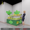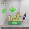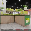 Phía bên ngoài được ốp một lớp gỗ MDF phủ sơn 07 màu xanh lá cây, rất phù hợp với không gian kiot trà thảo mộc tươi mát. Nổi bật trên đó là nhãn hiệu được in nổi bật, khiến khách hàng phải chú ý.