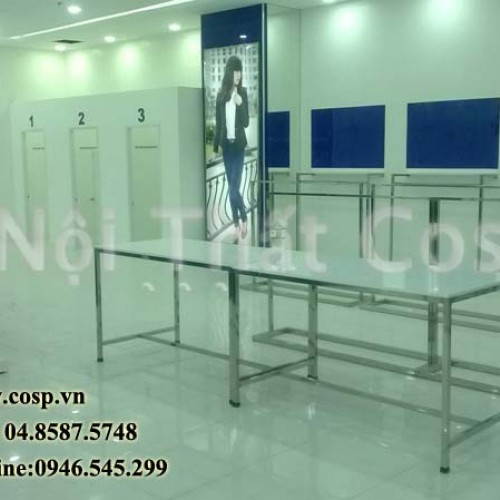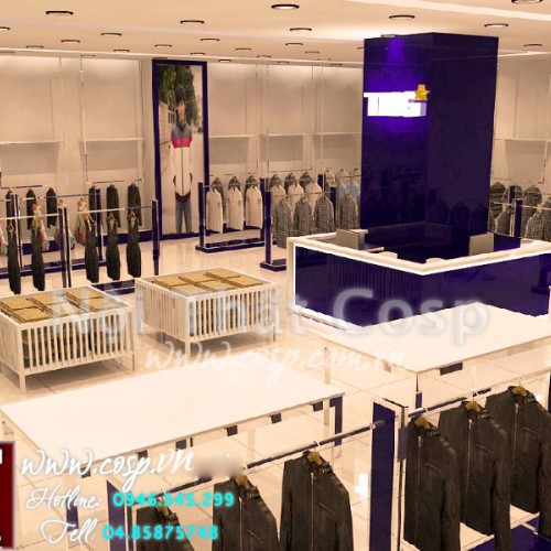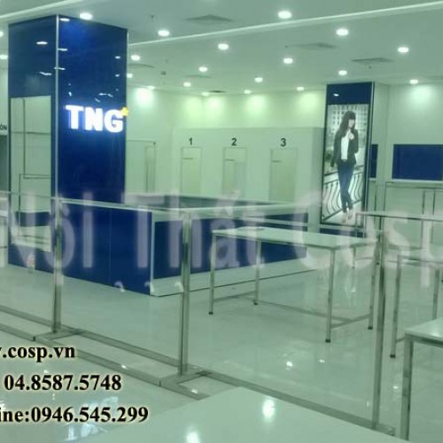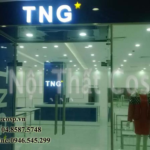 Ý tưởng thiết kế: Gian hàng thời trang TNG được thiết kế và thi công theo đặc trưng thương hiệu thời trang TNG. Điểm nhấn của gian hàng là quầy thu ngân ôm cột đặt tại trung tâm gian hàng.