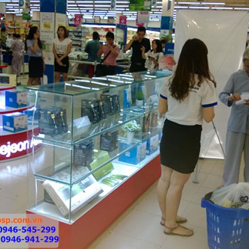Nhân viên bán hàng sẽ tư vấn tại chỗ + với hai bên hông do là lối đi lại chính trong siêu thị nên không muốn bị khuất không gian che mất sản phẩm.