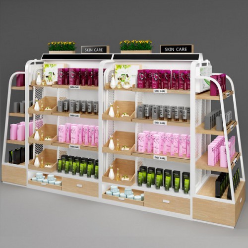 Tủ kệ bày mỹ phẩm thường được kết hợp với đèn LED để tăng vẻ bắt mắt. Tủ kệ thường có màu sắc thu hút như trắng, xanh,… Chất liệu sử dụng là gỗ melamine – gỗ công nghiệp phủ một lớp chống trầy, ẩm mốc, mối mọt. Bao quanh là các lớp kính giúp tăng tính thẩm mỹ, chuyên nghiệp hơn khi trưng bày mỹ phẩm.