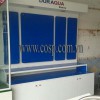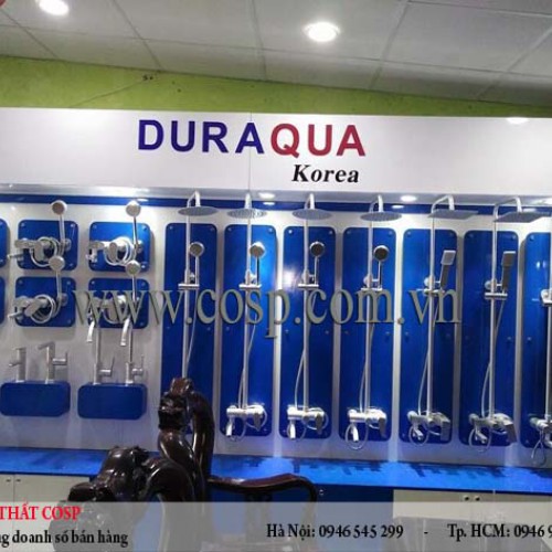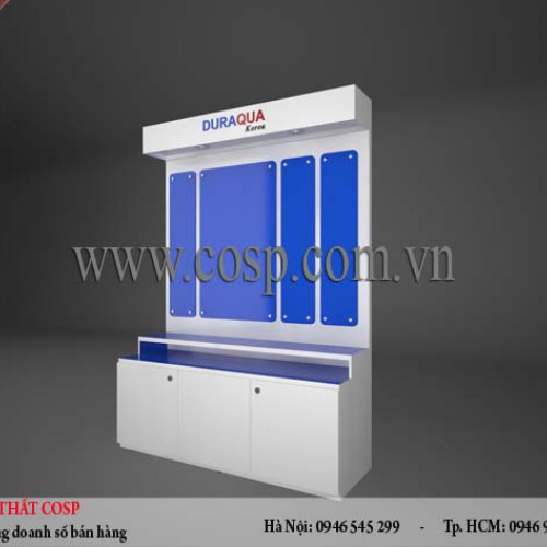 Kệ trưng bày thiết bị vệ sinh được thiết kế sử dụng 2 màu trắng và xanh nước biển để kết hợp hài hòa với màu sắc logo của thương hiệu thiết bị vệ sinh Duraqua.