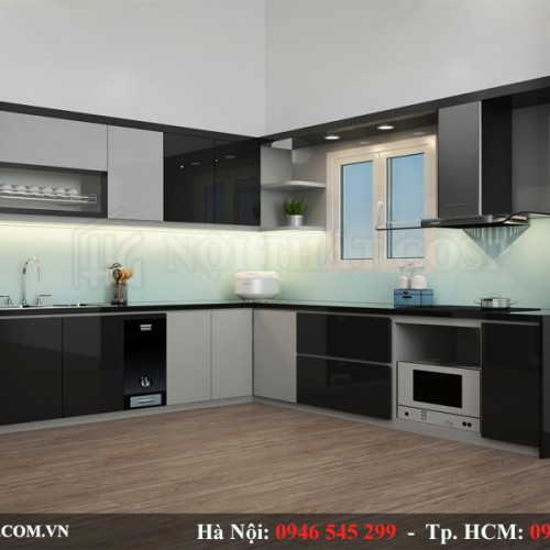 Chất liệu: gỗ MDF lõi xanh An Cường, sơn 2k, phụ kiện Việt Home, kính cường lực ốp bếp.