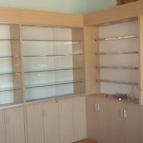 Các hạng mục : 3 tủ kính lớn sát tường, 1 tủ thấp chữ L và 1 tủ chữ I