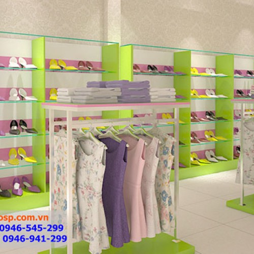 Các mặt tầng thì được làm từ kính để cho thiết kế tủ shop quần áo có nét thanh mảnh, nhẹ nhàng chứ không quá nặng nề.