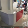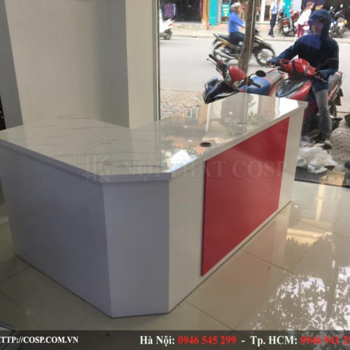 Quấy thu ngân với tủ mẫu Nhật Bản sang trọng và hiện đại. Tủ hình chữ L có cốt gỗ MDF kết hợp màu sơn trắng và đỏ, bề mặt vân đá bóng rất đẹp chuyên nghiệp.