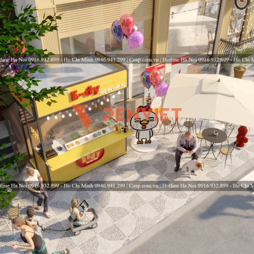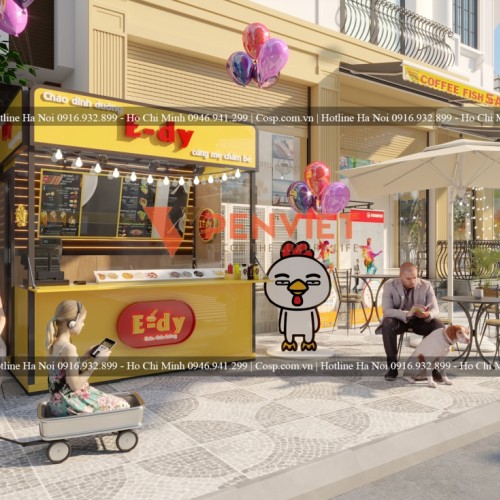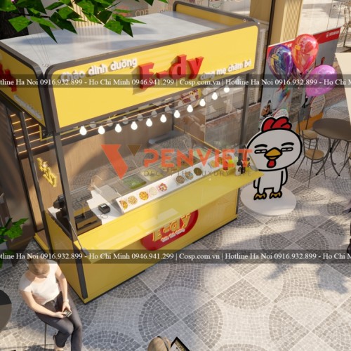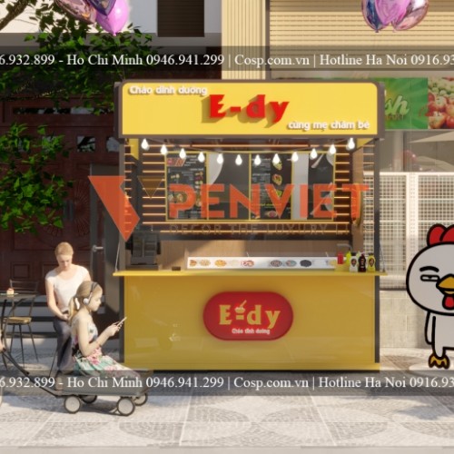 Sau khi tìm hiểu thông tin trên mạng, anh Nguyên ở Quận 9, TP.HCM đã liên hệ với Nội thất Cosp để thiết kế kiot cho gian hàng cháo dinh dưỡng E-dy của mình. Vì sản phẩm mà gian hàng đang bán là cháo dinh dưỡng dành cho trẻ nhỏ nên Cosp quyết định sử dụng hình ảnh chú gà đáng yêu để tạo sự thu hút và nét đặc trưng cho gian hàng của anh Nguyên.