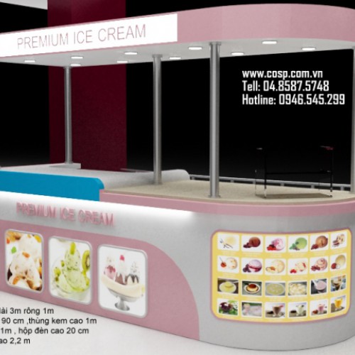 Quầy kem có kích thước dài 3m, rộng 1m, tổng chiều cao 2,2m, được thiết kế gồm 3 phần chính: