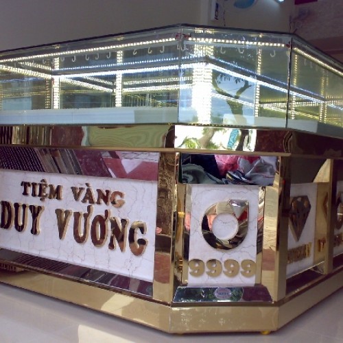Sử dụng màu vàng gold và trắng làm chủ đạo mang đến cảm giác sang trọng, đẳng cấp cho tiệm. Vật liệu được sử dụng cho mẫu tủ là inox và kính cường lực mang đến sự chắc chắn cũng như giúp nhân viên thuận lợi trong việc giới thiệu sản phẩm. Những chi tiết bo tròn cho thấy sự tinh tế trong mẫu tủ tránh những sự cố đáng tiếc xảy ra cho khách hàng.