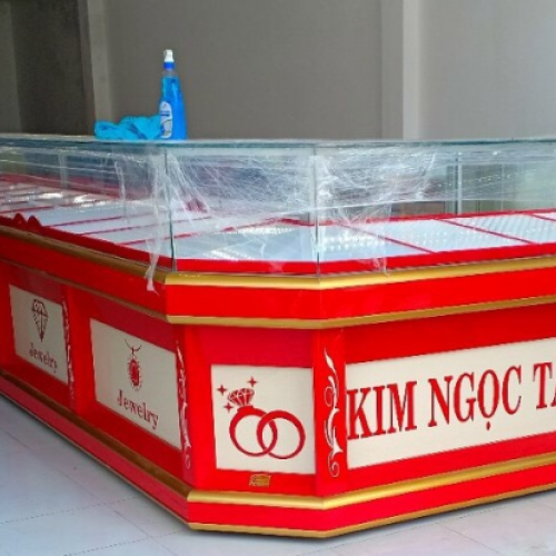 Mẫu tủ vàng được thiết kế với chất liệu Mica kết hợp với phần nẹp viền inox vàng gương tạo không gian trưng bày các mặt hàng trang sức hiện đại, thanh lịch.