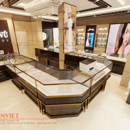 Hệ tủ chữ U và chữ L đều được làm từ chất liệu gỗ Acrylic An Cường chống ẩm tốt phủ mặt tiền và mặt trong Melamin. Bên cạnh đó, mẫu tủ vàng cao cấp này còn được kết hợp với kính cường lực siêu trong dày 10 ly, nẹp viền inox mạ xi vàng bắt bắt càng làm tôn thêm vẻ đẹp của các mặt hàng trang sức được trưng bày.