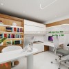 Phòng khám Minh Châu chọn bố trí quầy lễ tân kiểu dáng bo tròn mềm mại với màu trắng và xanh lá – hai tông màu chủ đạo. Logo phòng khám được đặt trên bức tường phía sau với hệ thống đèn LED tạo điểm nhấn độc đáo. Bàn làm việc được sắp xếp gọn gàng, kết hợp máy tính và thiết bị hiện đại phục vụ tốt nhất cho bệnh nhân.