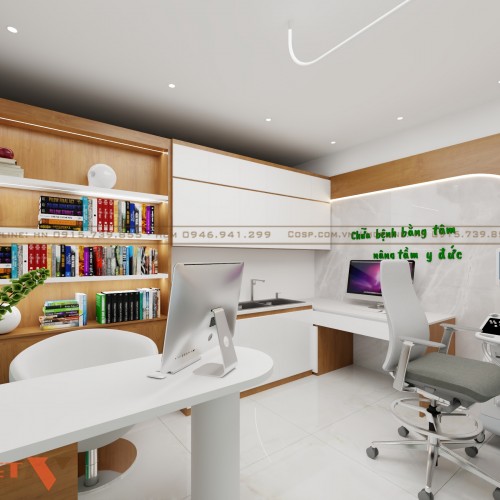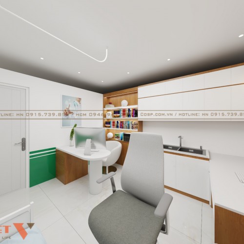 Bàn ghế gam màu trắng nổi bật, kích thước nhỏ gọn không chiếm quá nhiều diện tích nhưng vẫn đảm bảo thoải mái để y bác sĩ làm việc. Phía sau còn có hệ tủ trưng bày các tài liệu liên quan để y bác sĩ tham khảo cần thiết.