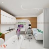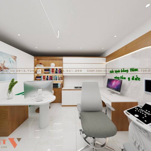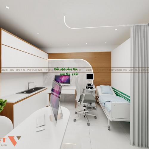 Ngoài ra còn có tủ đựng dụng cụ, khu vực lavabo rửa tay đảm bảo các tiêu chuẩn vệ sinh an toàn khi thăm khám. Đây là tiêu chí quan trọng khi thiết kế không gian phòng khám đa khoa phục vụ khách hàng.