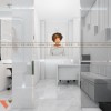Hành lang kết nối từ khu lễ tân đến phòng điều trị được thiết kế thông thoáng, lát đá trắng vân mây cao cấp, giúp phản chiếu ánh sáng tốt, tạo cảm giác rộng hơn thực tế. Một bên là hàng ghế chờ sát tường được bố trí xen kẽ cây xanh, giúp không gian thêm phần sinh động và gần gũi với thiên nhiên.