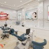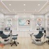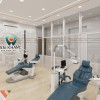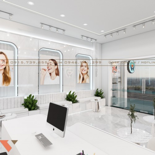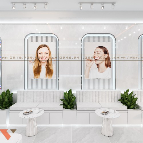 Các bức tường được ốp panel bóng, kết hợp tranh ảnh lớn về nụ cười và răng sứ, vừa mang tính thẩm mỹ vừa truyền thông hình ảnh dịch vụ hiệu quả. Hệ thống đèn trần dạng ray spotlight kết hợp đèn âm trần cung cấp ánh sáng đầy đủ, không gây chói mắt.
