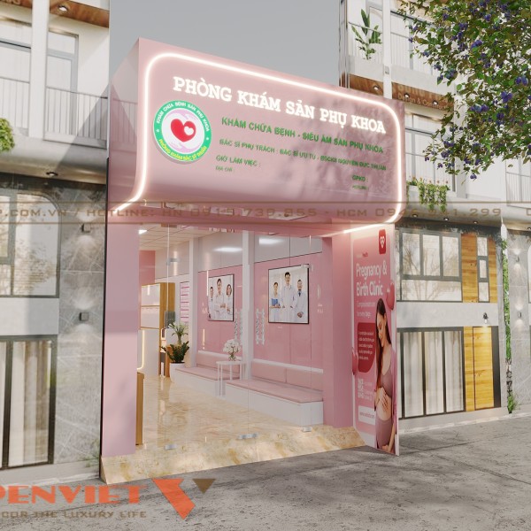 Biển bảng phòng khám sản phụ khoa trong hình được thiết kế nổi bật với tông màu hồng pastel chủ đạo, mang đến cảm giác nhẹ nhàng, thân thiện và phù hợp với lĩnh vực chăm sóc sức khỏe phụ nữ. Phần bảng hiệu chính được bố trí phía trên cửa ra vào, sử dụng chữ nổi màu trắng rõ nét trên nền hồng, giúp tên phòng khám “PHÒNG KHÁM SẢN PHỤ KHOA” dễ dàng nhận diện từ xa. Logo tròn đặt bên trái bảng hiệu với hình trái tim và đôi tay nâng đỡ, thể hiện thông điệp chăm sóc tận tâm.