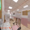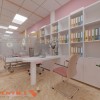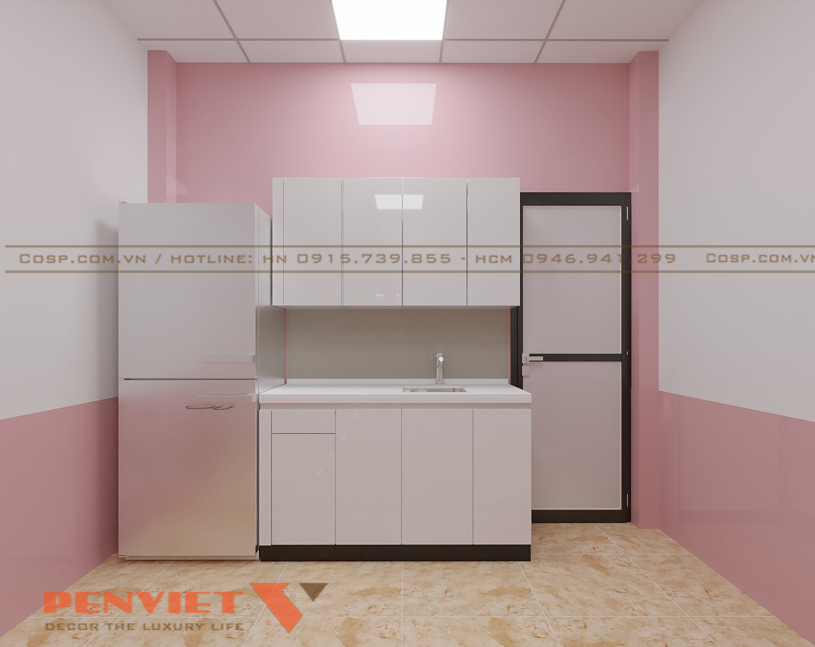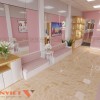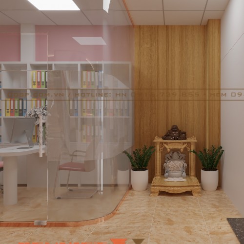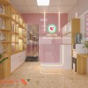 Bố trí không gian: Quầy lễ tân được đặt đối diện cửa ra vào, phía sau là logo phòng khám nổi bật trên nền hồng pastel, kết hợp ánh sáng đèn LED viền mềm mại. Màu sắc và ánh sáng được phối hợp nhằm tạo ấn tượng về sự chuyên nghiệp nhưng vẫn gần gũi.