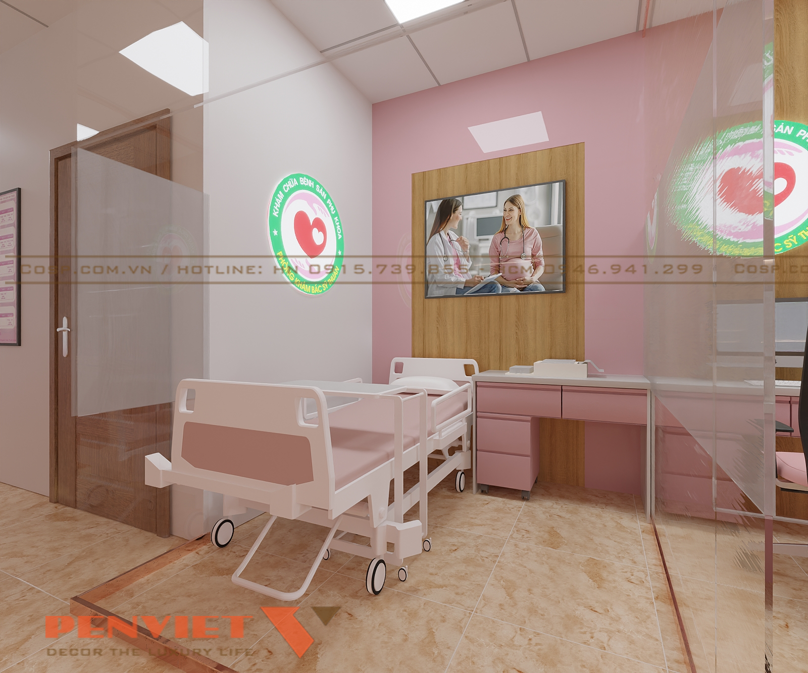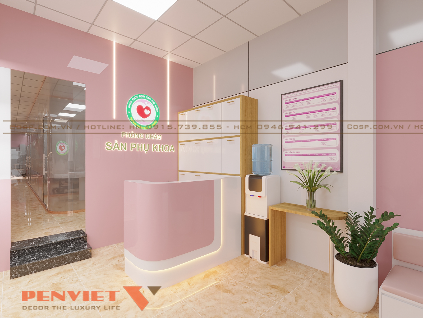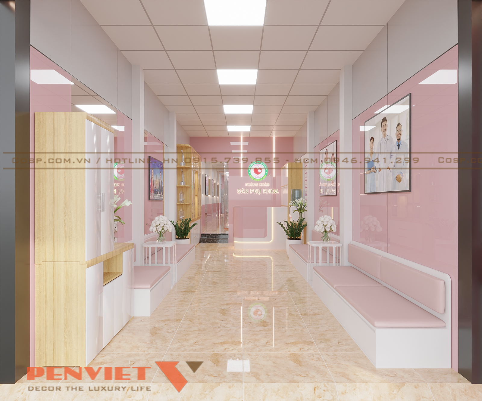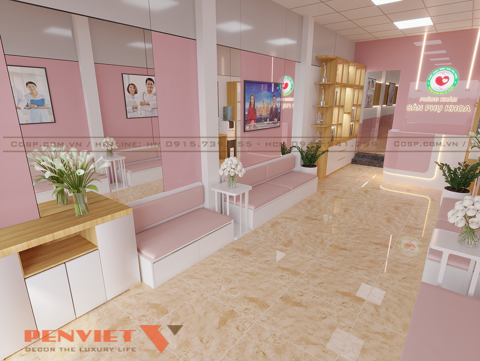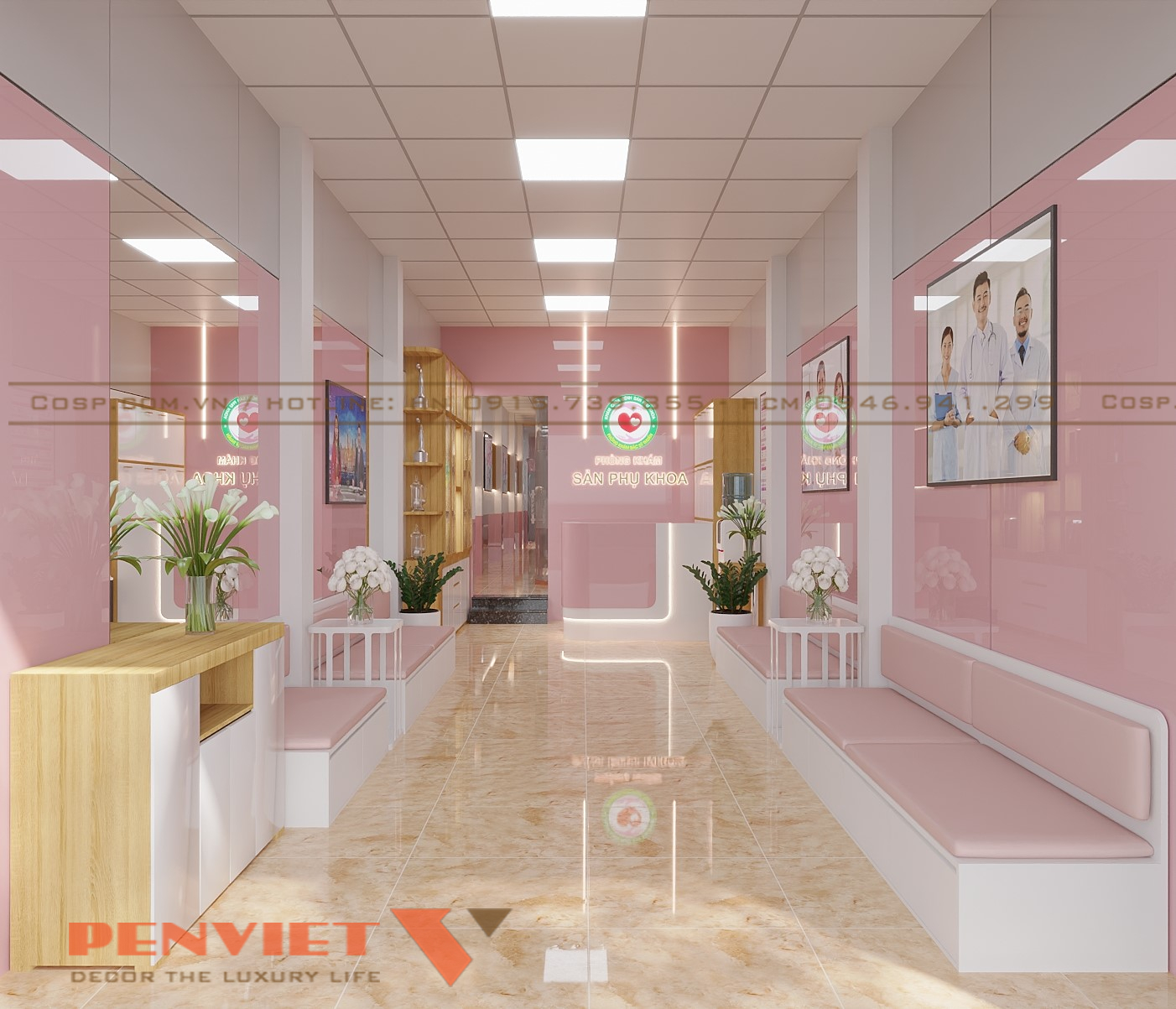 Màu sắc: Tông hồng pastel kết hợp trắng kem là lựa chọn chủ đạo. Màu hồng mang lại cảm giác dịu dàng, phù hợp đặc thù phòng khám sản, đồng thời tạo cảm giác sạch sẽ khi phối với trắng.