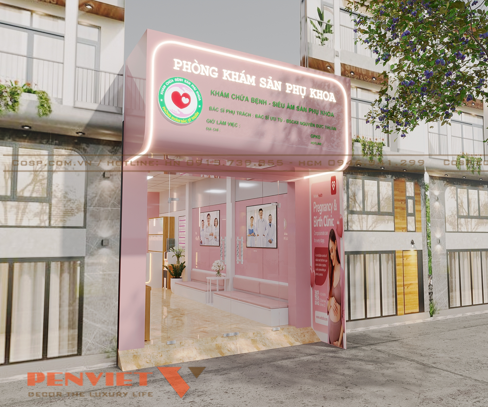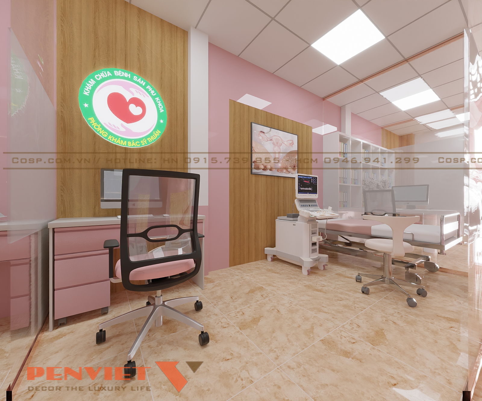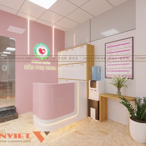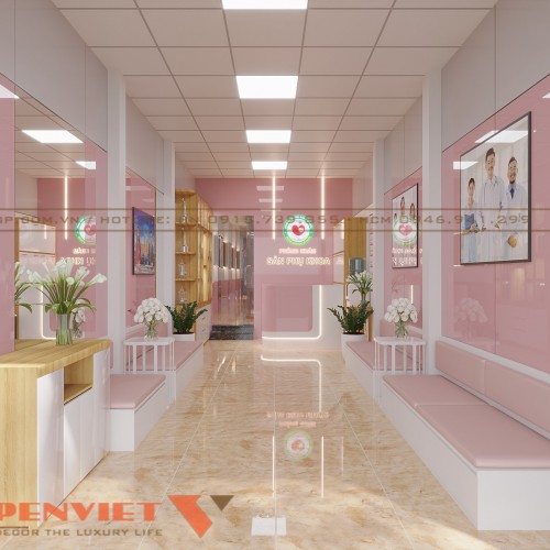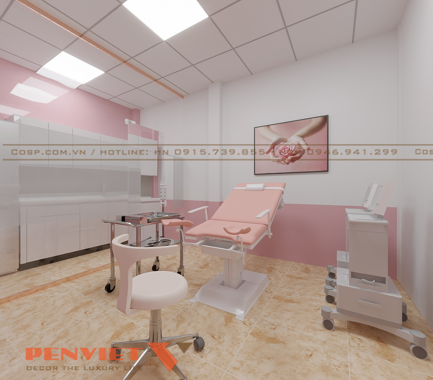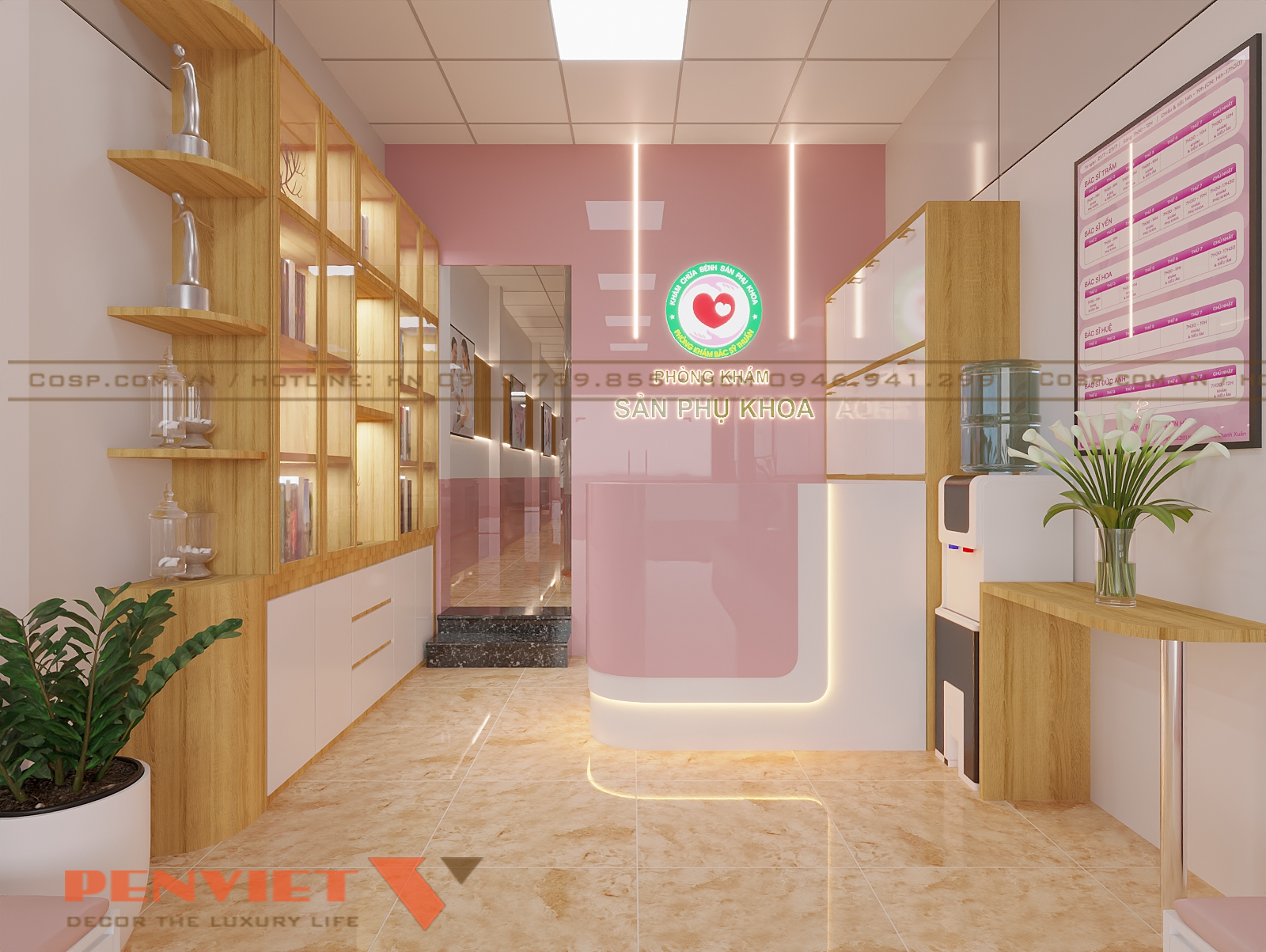 Màu sắc: Tông hồng pastel kết hợp trắng kem là lựa chọn chủ đạo. Màu hồng mang lại cảm giác dịu dàng, phù hợp đặc thù phòng khám sản, đồng thời tạo cảm giác sạch sẽ khi phối với trắng.