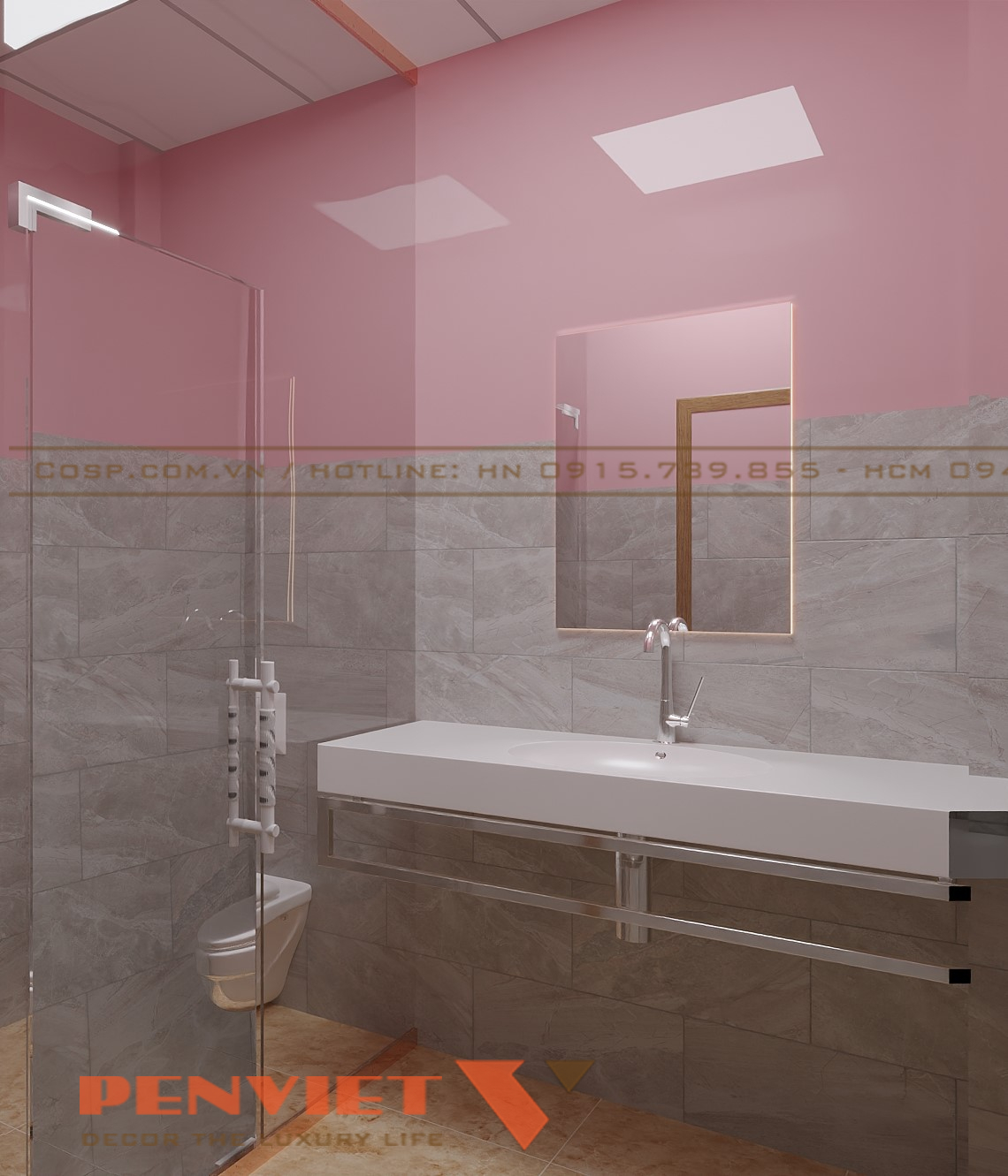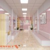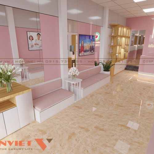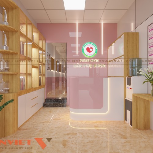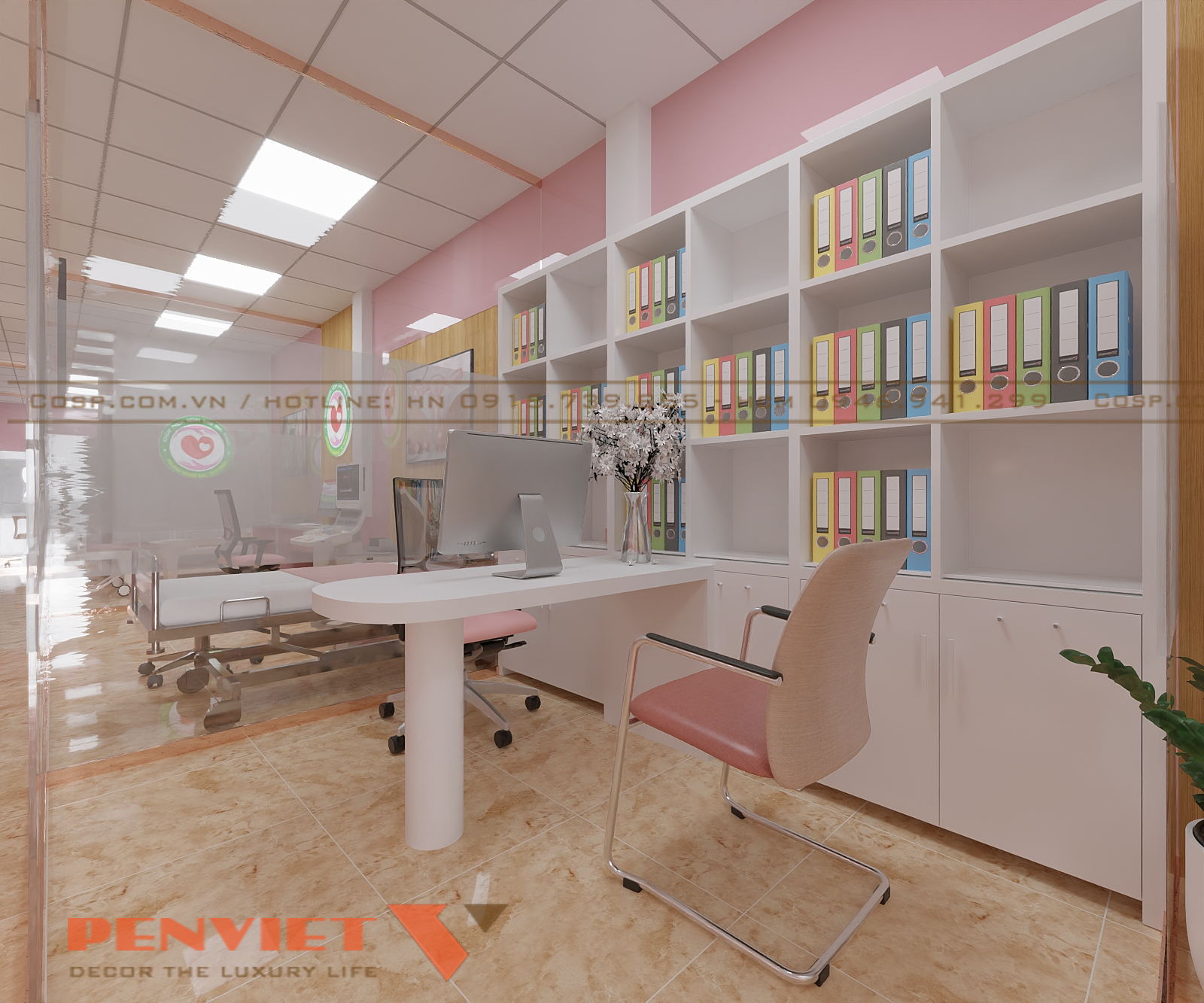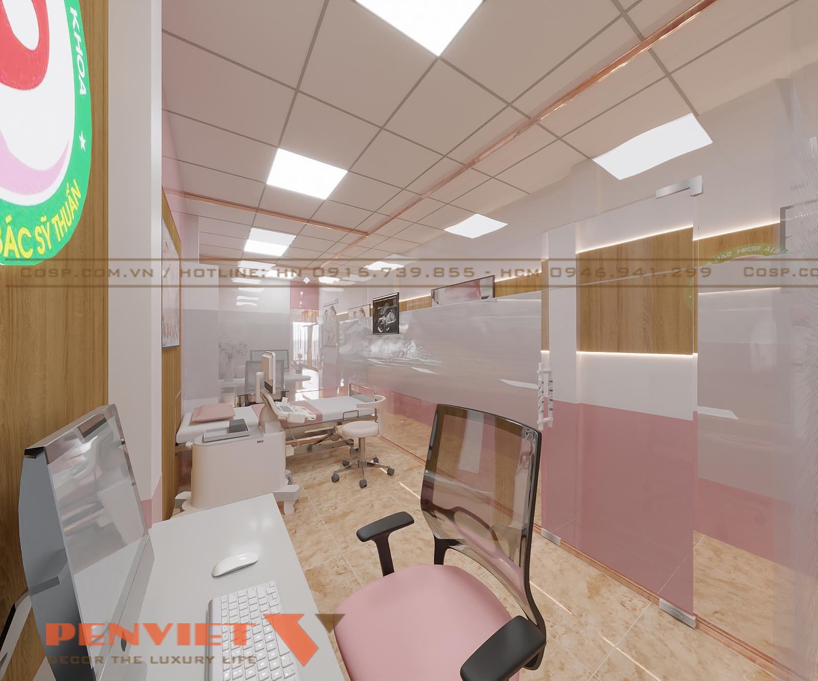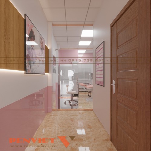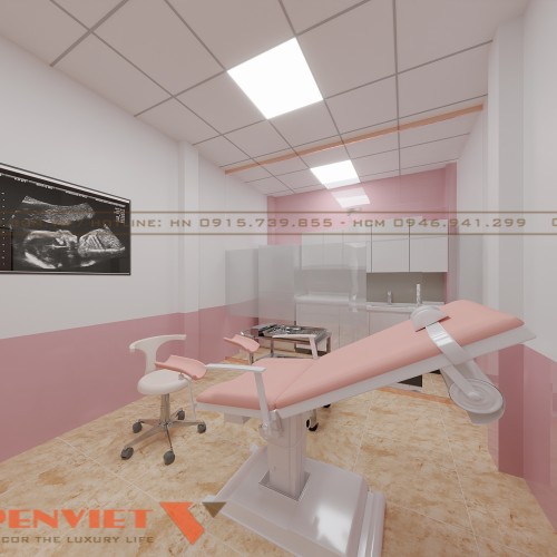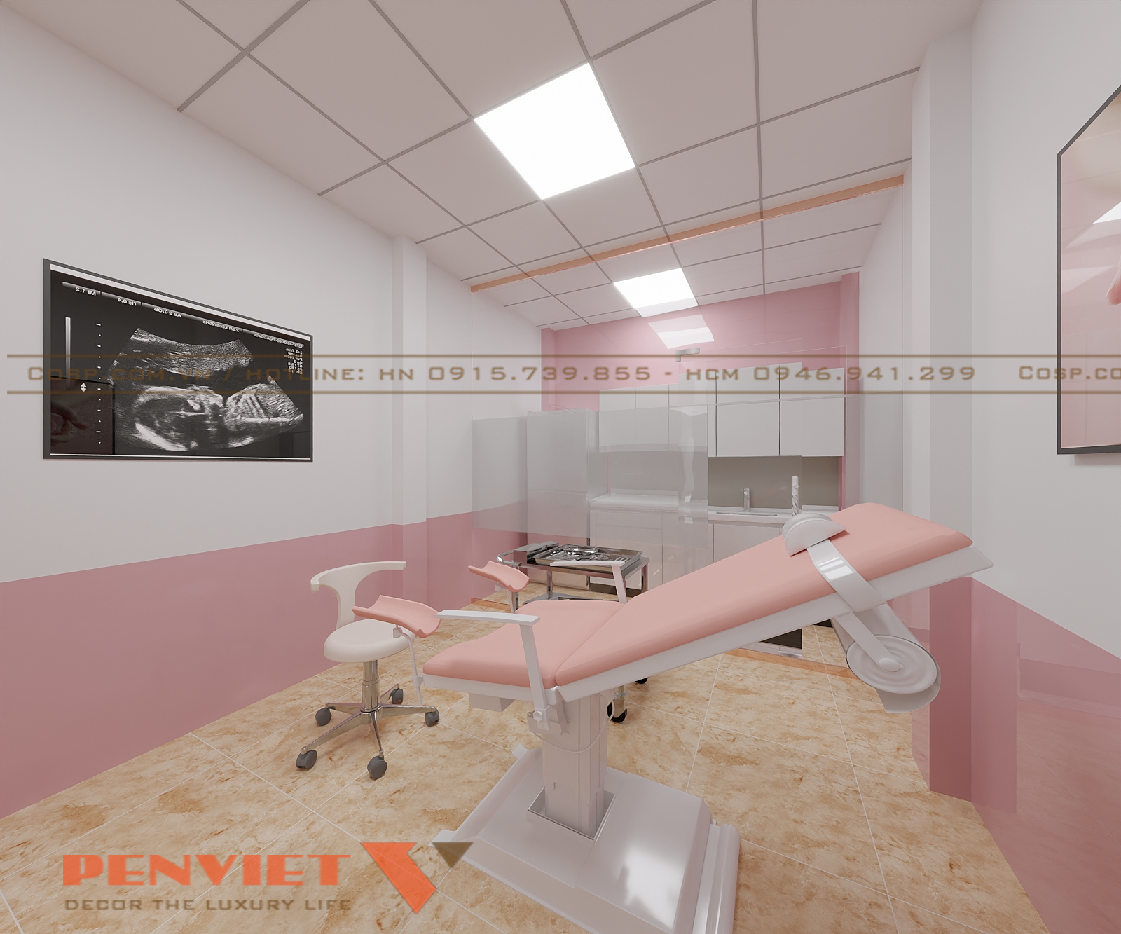 Màu sắc: Tông hồng pastel kết hợp trắng kem là lựa chọn chủ đạo. Màu hồng mang lại cảm giác dịu dàng, phù hợp đặc thù phòng khám sản, đồng thời tạo cảm giác sạch sẽ khi phối với trắng.