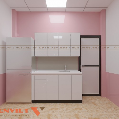 Vật liệu: Mặt quầy sử dụng gỗ công nghiệp phủ Melamine chống trầy xước, phần thân ốp kính acrylic hồng bóng gương dễ lau chùi. Đây là vật liệu vừa bền vừa dễ bảo trì, đáp ứng yêu cầu hoạt động liên tục của một phòng khám.
