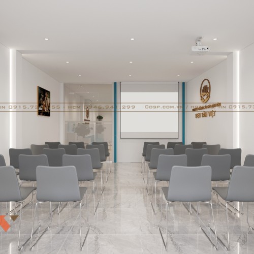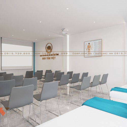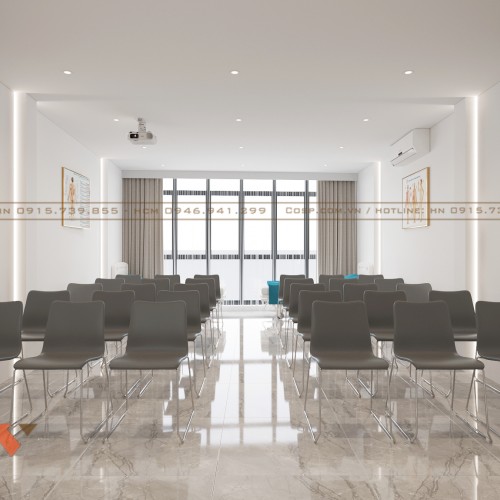 Phòng hội nghị của phòng khám có bố trí các ghế ngồi theo hàng để theo dõi nội dung trên máy chiếu thuận tiện. Logo thương hiệu hay các bức tranh trang trí được sắp xếp khoa học tăng điểm nhấn không gian.
