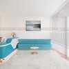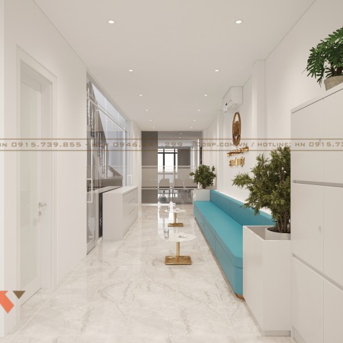 Khu chờ khám tại tầng 2 được thiết kế rộng rãi và tiện nghi, giúp khách hàng cảm thấy thoải mái trong khi chờ đợi. Băng ghế dài màu xanh bố trí dọc hành lang hỗ trợ khách hàng có thể thư giãn trong quá trình chờ đợi. Không gian này cũng được trang trí với cây cảnh xanh tươi, tạo cảm giác dễ chịu và thoải mái cho khách hàng.