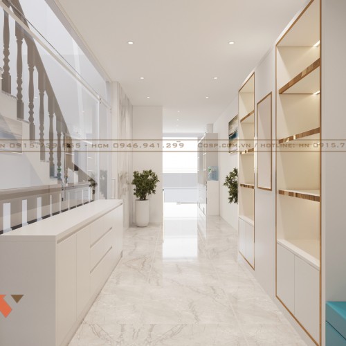 Phòng khám Sen Tâm Việt cũng được trang bị một hệ tủ trưng bày các sản phẩm chăm sóc sức khỏe, tài liệu giới thiệu dịch vụ. Hệ tủ được làm từ chất liệu gỗ MDF sơn trắng với nẹp viền inox vàng gold. Các kệ tủ được chiếu sáng bằng đèn LED, mang lại vẻ sang trọng và gọn gàng cho khu vực này.