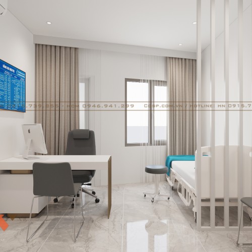Tiếp đến là không gian bàn làm việc kết hợp giường khám bệnh được thiết kế đơn giản. Khu vực này được thiết kế riêng biệt để đảm bảo sự yên tĩnh và tập trung cho y bác sĩ khi thăm khám. Giường khám được thiết kế chắc chắn, có nệm êm và điều chỉnh linh hoạt, giúp khách hàng dễ dàng nằm thoải mái trong suốt quá trình thăm khám.