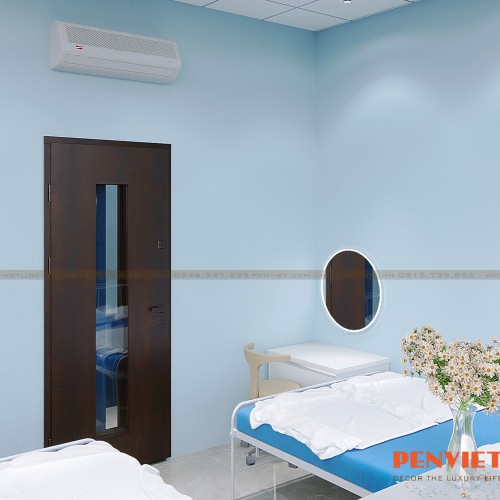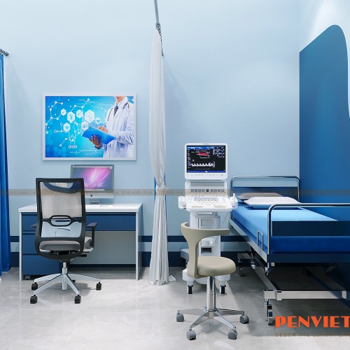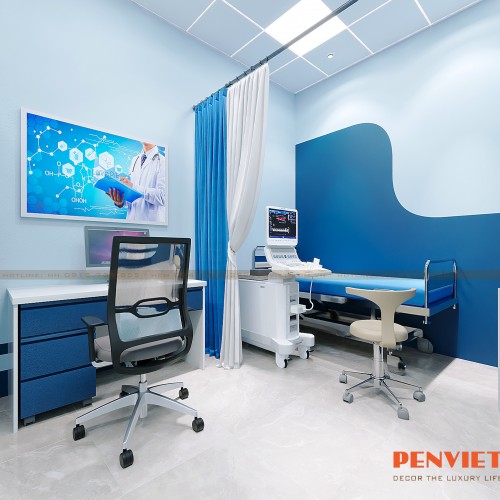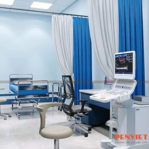 Tiếp theo là khu vực phòng khám nội của phương án thiết kế nội thất này. Tại đây có setup 1 giường khám, bàn tư vấn và máy móc phục vụ công việc. Để đảm bảo tính riêng tư cho bệnh nhân, PenViet sử dụng rèm che mỏng nhẹ tiện lợi có thể tháo xuống hay cất lên dễ dàng.