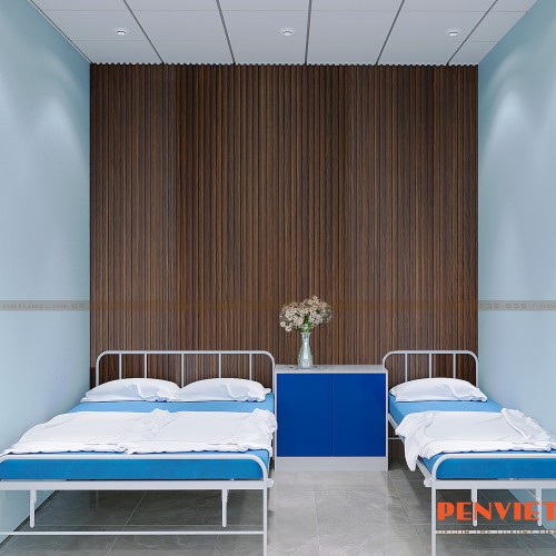Khu vực phòng nghỉ của mẫu thiết kế nội thất nhà thuốc kết hợp phòng khám Kính Vũ có bố trí 2 giường nằm. Trong đó có 1 giường đôi và 1 giường đơn phục vụ nhu cầu của bệnh nhân. Các bệnh nhân sau khi thăm khám, tiểu phẫu sẽ được nằm nghỉ tại đây để theo dõi và chăm sóc.