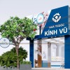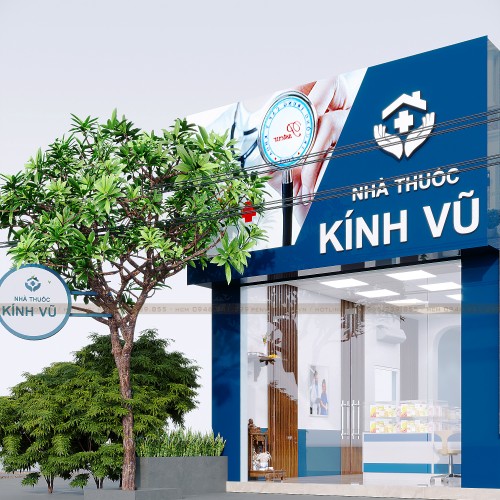 Nhà thuốc Kính Vũ nổi bật giữa phố xá với hệ thống biển bảng lớn gam màu xanh dương. Từ xa, quý khách hàng sẽ dễ dàng nhìn thấy thương hiệu Kính Vũ để lựa chọn đến thăm khám, mua thuốc. Đây chính là ý đồ của chủ đầu tư để tăng nhận diện thương hiệu thông qua biển bảng.