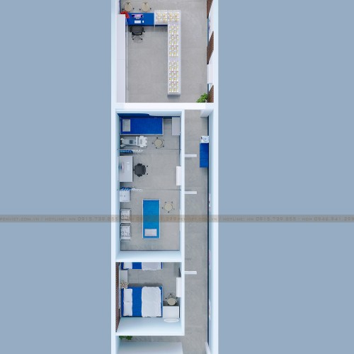 Khu vực tiểu phẫu ngay kế bên phòng khám nội theo như mục đích của chủ đầu tư. Phòng tiểu phẫu được ngăn cách với khu vực khám nội bởi hệ thống rèm che. Nơi đây cần đảm bảo các yếu tố tiệt trùng để hạn chế lây nhiễm chéo vi khuẩn cho bệnh nhân.