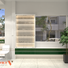 Các kệ trưng bày được thiết kế đơn giản nhưng tinh tế chú trọng tôn vinh sản phẩm. Chất liệu chính là gỗ MDF kết hợp kính cường lực trong suốt. Kệ có chiều cao vừa phải, giúp khách hàng dễ dàng quan sát và lựa chọn sản phẩm.
