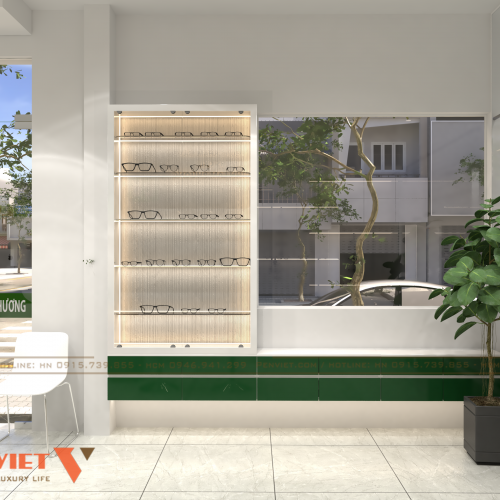 Khu vực trưng bày kính mắt là điểm nhấn quan trọng nhất của phòng khám và là nơi khách hàng thu hút ngay từ cái nhìn đầu tiên. Tông màu chủ đạo là trắng gợi lên cảm giác sạch sẽ, chuyên nghiệp nhưng gần gũi.