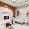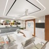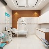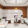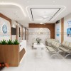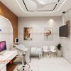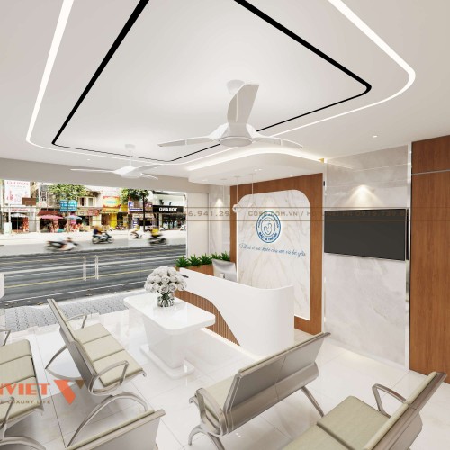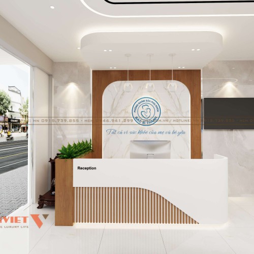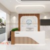 Bước vào bên trong phòng khám, khu vực đầu tiên khách hàng sẽ tiếp xúc là quầy lễ tân. Quầy lễ tân được thiết kế với đường nét bo tròn mềm mại, chiều cao trung bình, phù hợp với việc tiếp đón hỗ trợ tư vấn khách hàng. Màu sắc chủ đạo của quầy lễ tân là trắng với các chi tiết nâu điểm xuyết hài hòa với tổng thể không gian.
