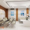 Khu vực đón tiếp khách được bố trí ngay liền kề quầy lễ tân với các băng ghế dài màu kem sữa bọc da sang trọng. Bên cạnh đó là chiếc bàn lớn để chính giữa không gian để bệnh nhân điền thông tin theo yêu cầu.