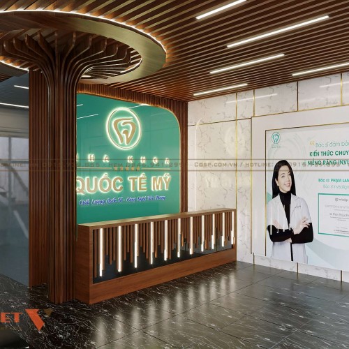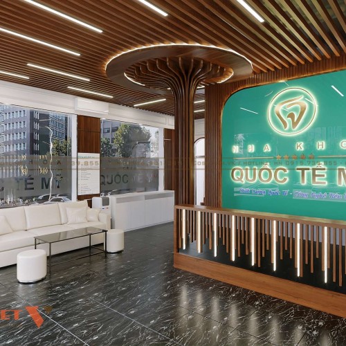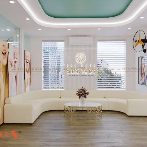 Thiết kế nội thất của phòng khám răng hàm mặt Quốc Tế Mỹ toát lên vẻ sang trọng và hiện đại. Tầng 1 gồm có sảnh chờ và quầy lễ tân đón tiếp khách đến sử dụng dịch vụ. Tổng thể thiết kế mang lại cảm giác thân thiện, chuyên nghiệp phù hợp với một cơ sở y tế cao cấp.