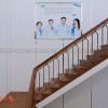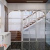 Phía sau quầy lễ tân là cầu thang gỗ với tay vịn uốn lượn, dẫn lên các khu vực khác trong phòng khám. Sàn nhà lát đá cẩm thạch với hoa văn tinh tế, tạo thêm sự sang trọng cho không gian.