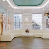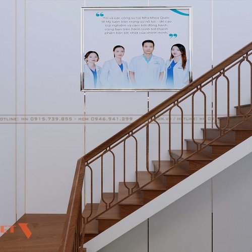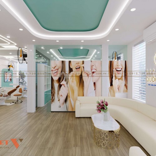 Phía sau là những bức ảnh trang trí với nụ cười rạng rỡ tạo sự tin tưởng cho khách hàng. Bức tranh trang trí góp phần tạo cho không gian thêm phần hài hòa. Trần nhà được thiết kế với đường viền LED hiện đại tạo điểm nhấn nổi bật cho không gian cũng như tăng cường ánh sáng cho phòng khám. Sàn nhà sử dụng vật liệu gỗ cao cấp mang đến cảm giác ấm áp và thân thiện cho bệnh nhân khi bước vào.