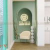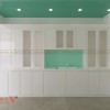 Phía sau ghế nha khoa trong phòng tiểu phẫu là hệ thống tủ kệ màu trắng với các ô vuông được chia đều. Tại đây có thể trưng bày chứng chỉ và cúp giải thưởng của phòng khám tăng thêm sự tin tưởng.