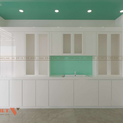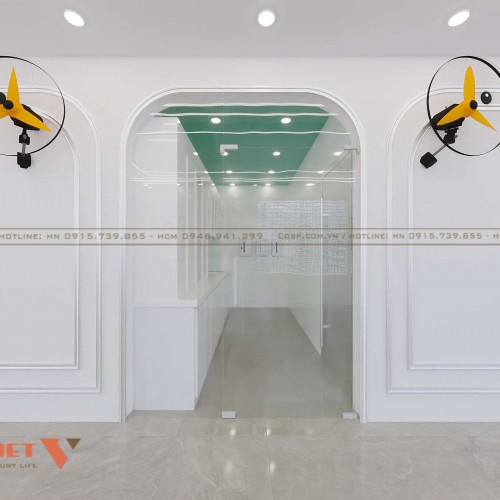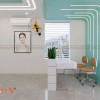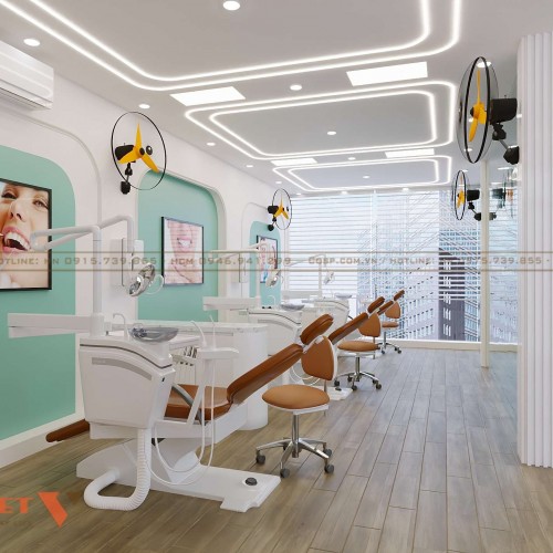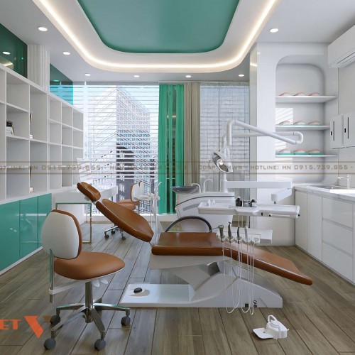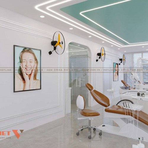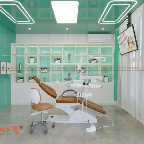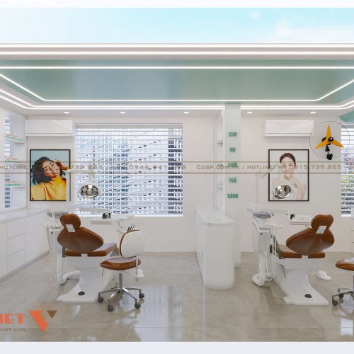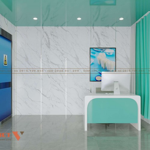 Phòng khám nha chung nổi bật với gam màu chủ đạo là trắng và xanh ngọc tạo nên sự tươi mới và sạch sẽ. Hệ thống đèn LED được lắp đặt khéo léo trên trần vừa cung cấp ánh sáng cần thiết vừa tạo điểm nhấn thẩm mỹ.
