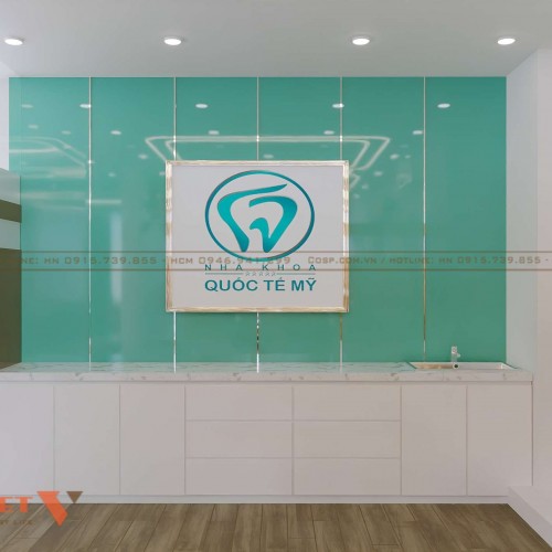 Khu vực quầy lễ tân nổi bật với bảng hiệu phát sáng màu xanh ngọc, in rõ tên phòng khám "NHA KHOA QUỐC TẾ MỸ" và khẩu hiệu "Chất Lượng Quốc Tế - Công Nghệ Tiên Phong". Tông màu gỗ ấm kết hợp với màu xanh của bảng hiệu tạo cảm giác thoải mái và chuyên nghiệp cho khách hàng.