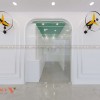 Sảnh chờ được trang bị ghế sofa màu trắng tinh tế, bàn kính và các chi tiết trang trí tinh xảo như kệ thờ và chậu cây xanh. Trần nhà được thiết kế với các thanh gỗ tạo hình nghệ thuật, kết hợp cùng hệ thống đèn LED tạo nên ánh sáng ấm cúng và tinh tế.