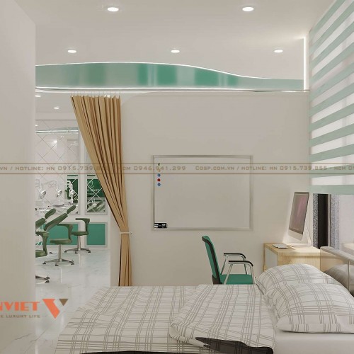 Đặc biệt vách có sự liên kết liền mạch với hệ tủ trưng bày vừa là vách ngăn khu vực bên ngoài và giường nghỉ cho bệnh nhân bên trong. Phương án setup tinh tế này giúp tận dụng tủ để trưng bày các kỷ niệm chương, bằng cấp vừa tạo tính riêng tư cho không gian khác.